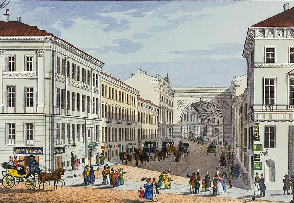 noordwest-risaliet Winterpaleis met Paleis-pontonbrug aangelegd van 1853 tot 1856. Deze pontonbrug is een verplaatsing stroomopwaarts van de oude Isaakievskij pontonbrug uit 1727, toen de permanente Blagovesjtsjenskij Brug (1843 – 1850), (vanaf 1855 Nikolajevskij Brug) gereedkwam. Bij de bouw van de permanente Paleisbrug (1912 – 1916) werd de pontonbrug teruggelegd op de plaats van de oude Isaakievskij-pontonbrug, en vloog daar in 1916 in brand. litho, 1856 – 1862, Jacottet et Bachelier, uitgeverij Daziaro, naar een tekening van Joseph-Maria Charlemagne-Baudet (1824 – 1870).